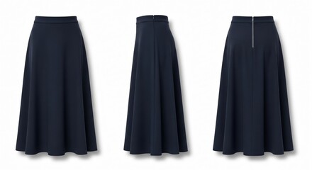 Three Views of a Navy Blue Maxi Skirt Isolated.