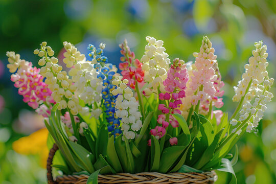 A close-up view of a basket filled with spring flowers, ready to be handed out during a May Day celebration, with the focus on the variety and brightness of the flowers
