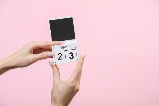 May 23. female hand sets the date on the calendar. Spring season. White cubic calendar on the table with flowers. Change the date in a month. Holiday day. Important date on the calendar.