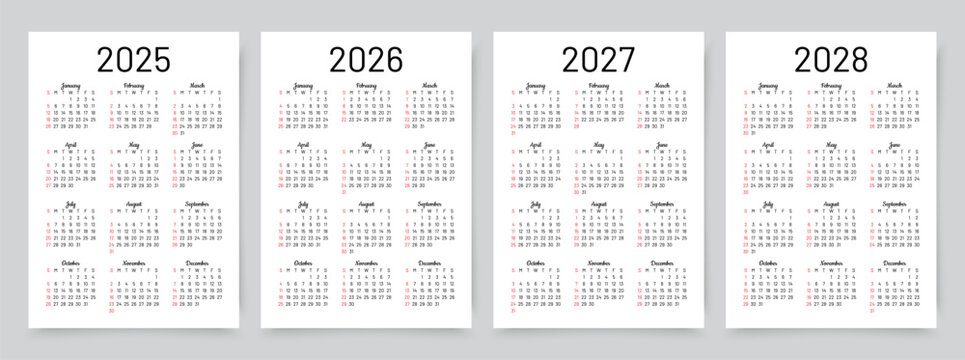 2025, 2026, 2027, 2028 calendars for year. Calender templates. Week starts Sunday. Organizer with 12 month in English. Scheduler layout. Simple planner. Portrait orientation, A4. Vector illustration