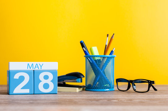 May 28th. Day 28 of month, calendar on business office table, workplace at yellow background. Spring time