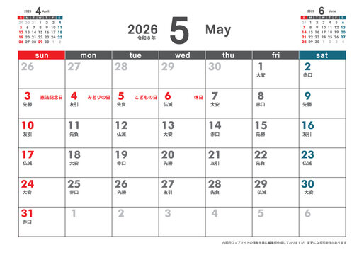 日曜始まり卓上カレンダー令和8年 2026年5月 3ヶ月表示 六曜 ビジネス シンプルカレンダー素材