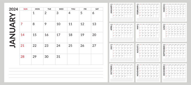 Vector calendar for 2024 year design with simple graphic for office planning with months and weeks. Annual daily organizer template