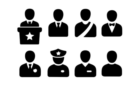 Government Hierarchy Icons. Solid, filled icon set of government hierarchy: president, senator, governor, mayor, councilor, officer, clerk, citizen. Solid,