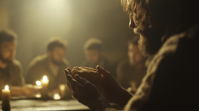 Cinematic, close-up of Jesus hands breaking the bread, the soft candlelight casting warm shadows.