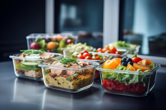 Glass containers filled with a variety of food items. Meal prep containers filled with fresh vegetables, nutritious contents.