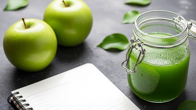 Creating a fitness meal plan with a healthy green smoothie and fresh apples in a planner