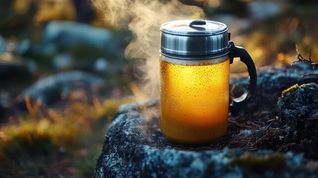 Thermos with hot soup ready for a warming meal on the go