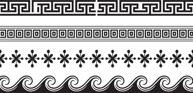 Greek key ornaments collection. Meander pattern set. Repeating geometric meandros motif. Greek fret design. Ancient decorative border. Vector