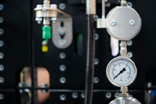 Pressure gauges mounted on the pipeline. Measuring instruments for pressure control. Industrial concept