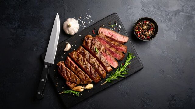 Sizzling Steak: Juicy Grilled Beef Slices on Dark Wood Board
