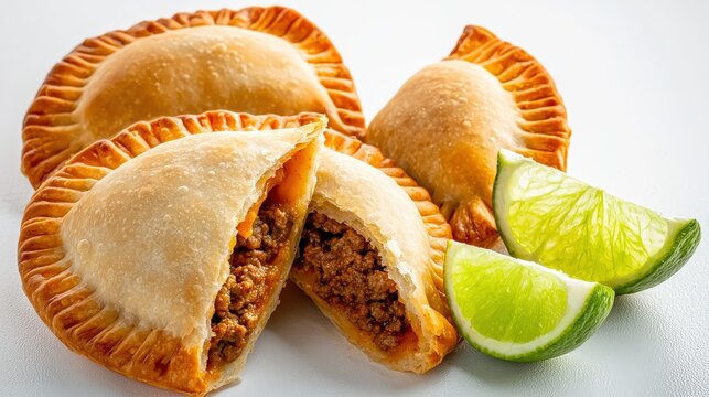 Traditional handheld empanadas filled with seasoned minced meat served with fresh lime wedges on a white surface perfect for Mexican cuisine and snack dishes