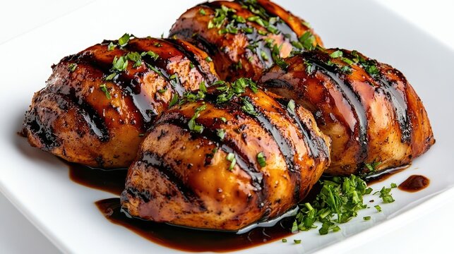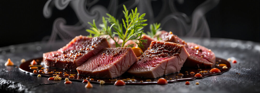 A succulent grilled meat entree, perfectly seared and glistening, is elegantly presented on a rustic plate with a flavorful reduction sauce and garnished with fresh herbs and fruit