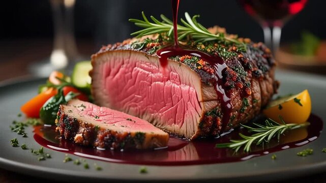 A succulent medium-rare roast beef tenderloin being drizzled with a rich red wine reduction sauce for a gourmet dining experience