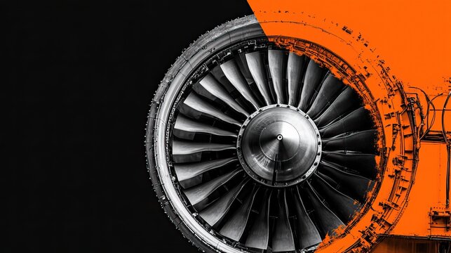 A massive industrial turbine engine with rotating blades on a black and orange gradient background