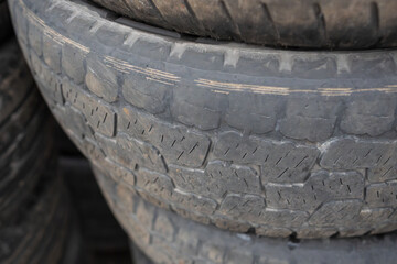 Stack of car tires showing tire tread close up