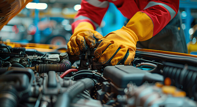 A mechanic wearing red suit and yellow gloves is diligently working on a car engine under the car hood, emphasizing professional auto repair and maintenance