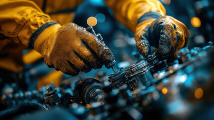 A mechanic wearing red suit and yellow gloves is diligently working on a car engine under the car hood, emphasizing professional auto repair and maintenance.