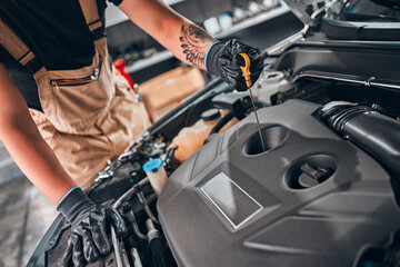 Auto mechanic working and repair on car engine in mechanics garage. Car service.