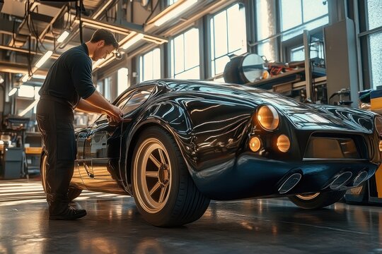 Mechanic in Uniform Inspecting Sleek Black Car in Modern Garage with Sunlight and Detailed Reflections