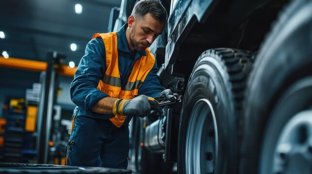 Truck maintenance tips, with a mechanic working on the engine, changing oil, and checking the tires in a garage