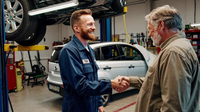 Professional mechanic greeting satisfied customer, sealing automotive repair deal with confident handshake inside modern workshop