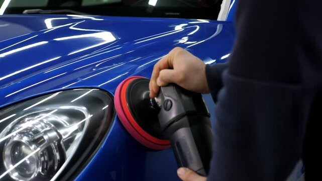 A man polishes a blue car with a car polishing machine at a car dealership. Car detailing and polishing concept.