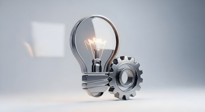 Glowing illumination bulb containing a mechanical gear symbol rests against a vibrant orange background