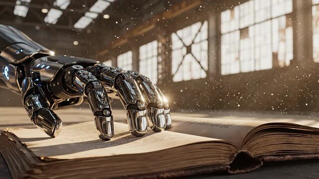 Humanoid robot reading a book in a library representing artificial intelligence, learning, and the fusion of knowledge and technology.