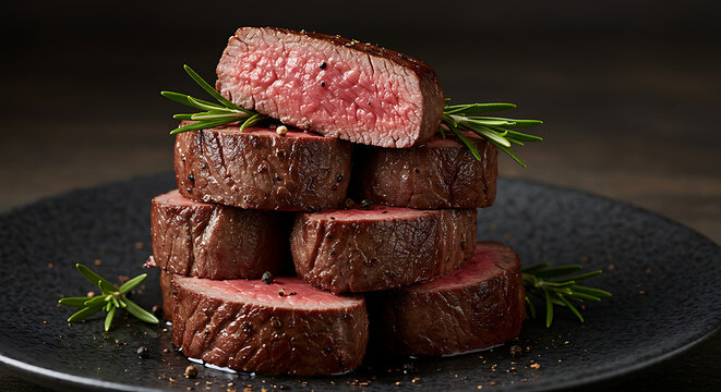 Rare beef tenderloin medallions stacked on plate with meat juices pooling underneath, garnished with rosemary