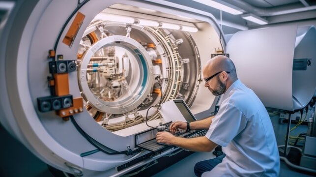 Service technician repairing an MRI machine at a hospital.