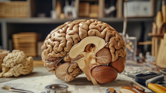 An educational scene featuring a human brain cross-section with labeled parts, alongside medical charts and anatomical references for a classroom setting.