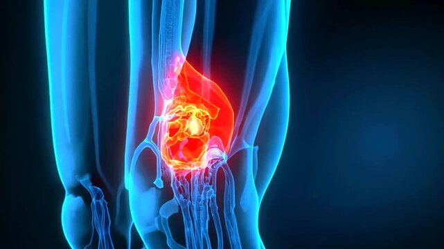Blue 3D x-ray of knee and body, showing joint and bone injuries