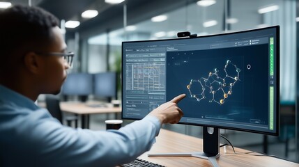 A scientist analyzes complex 3D molecular data on a high-resolution computer screen, working on a medical breakthrough in a modern, state-of-the-art laboratory.