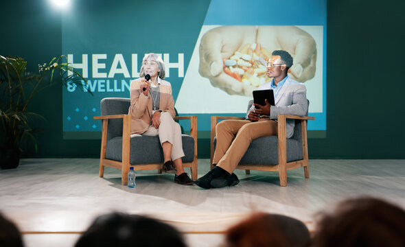 Speaker, health seminar and speech of woman on stage with host on mic and tablet at event. Workshop, talk and conference presentation on wellness, medicine or medical innovation of drugs with guest