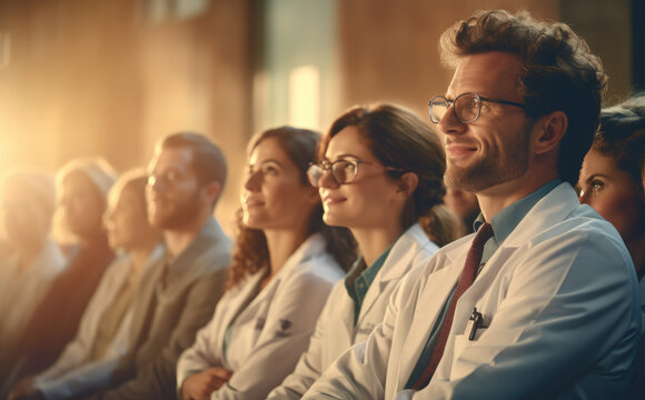 Stethoscope on conference table during medical presentation. Doctors in white coats listen intently to digital screen. Modern health care meeting for learning, communication in clinic hospital