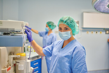 Surgeon using medical equipment in operating room of the hospital