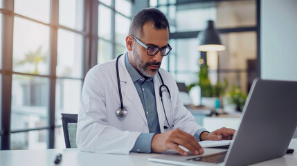 doctor sitting at the desk using laptop for remote consultation, modern digital technology use in medical field