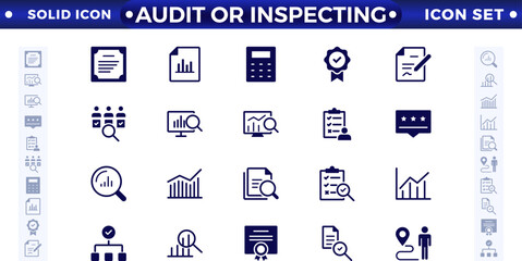 Audit or inspect icons set in solid design. Pack of inspection, hire, calculation money, coaching, protection, cooperation, success, task, and other pictograms, solid icons.