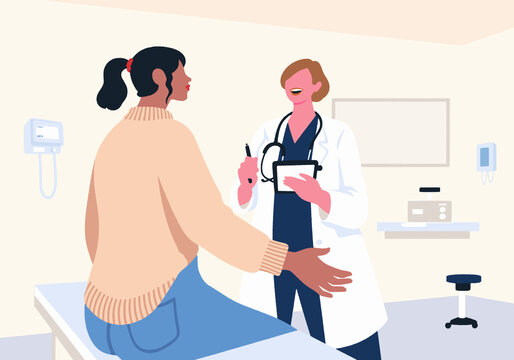 Female doctor consulting woman sitting on examination table at clinic