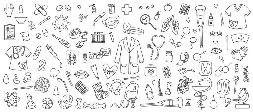 Hand drawn medical and medical drawings. Healthcare, pharmacy, medical icons collection. Vector illustration
