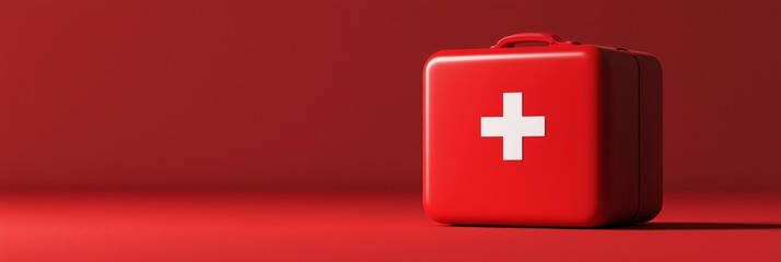 A vibrant red first aid kit against a teal background, perfect for health and safety themes in medical design.