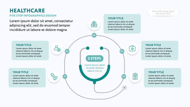 Healthcare infographics 5-step template design with stethoscope - for medical business presentation slide