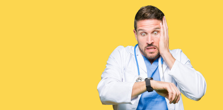 Doctor in a medical gown sitting at a desk, checking a wristwatch with a focused expression, emphasizing concepts of time management, appointments, and waiting, highlighting healthcare efficiency