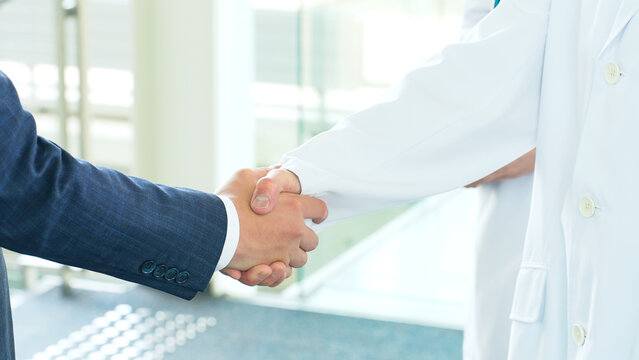Businessman and  doctor, researcher shaking hands in lobby