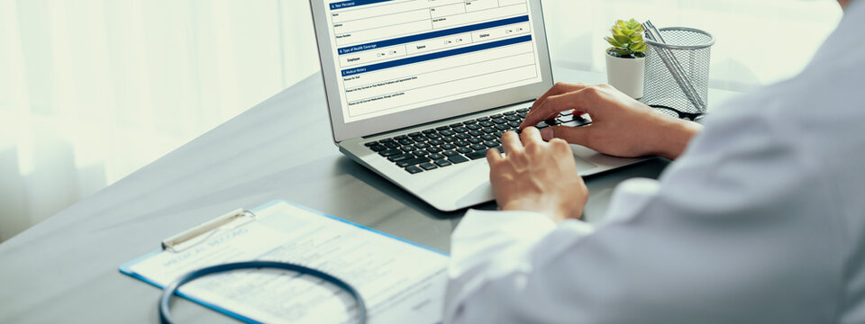 Doctor diagnose digital patient record on virtual medical network on Computing electronic medical record. Digital healthcare and network connection interface, Global health care. Medical technology.