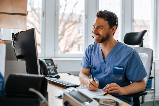 Happy male medical professional writing while doing online consultation on video call through computer at clinic