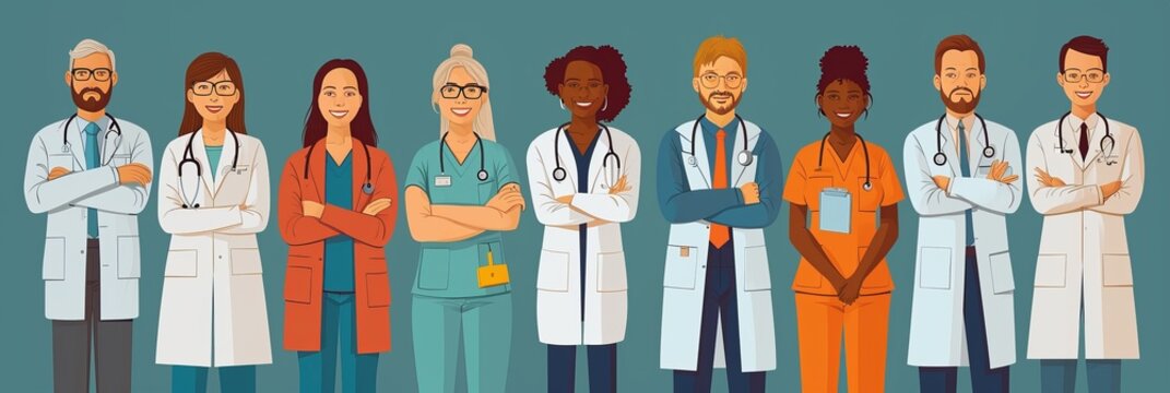 A comprehensive illustration of medical staff collaborating to provide diverse patient care