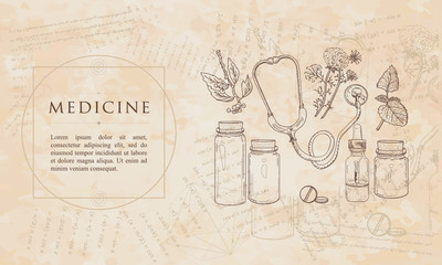 Medicine. Medical concept. Renaissance background. Medieval manuscript, engraving art