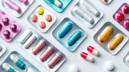 Colorful capsules and tablets in blister packs arranged in a flat lay, showcasing various medications and supplements.